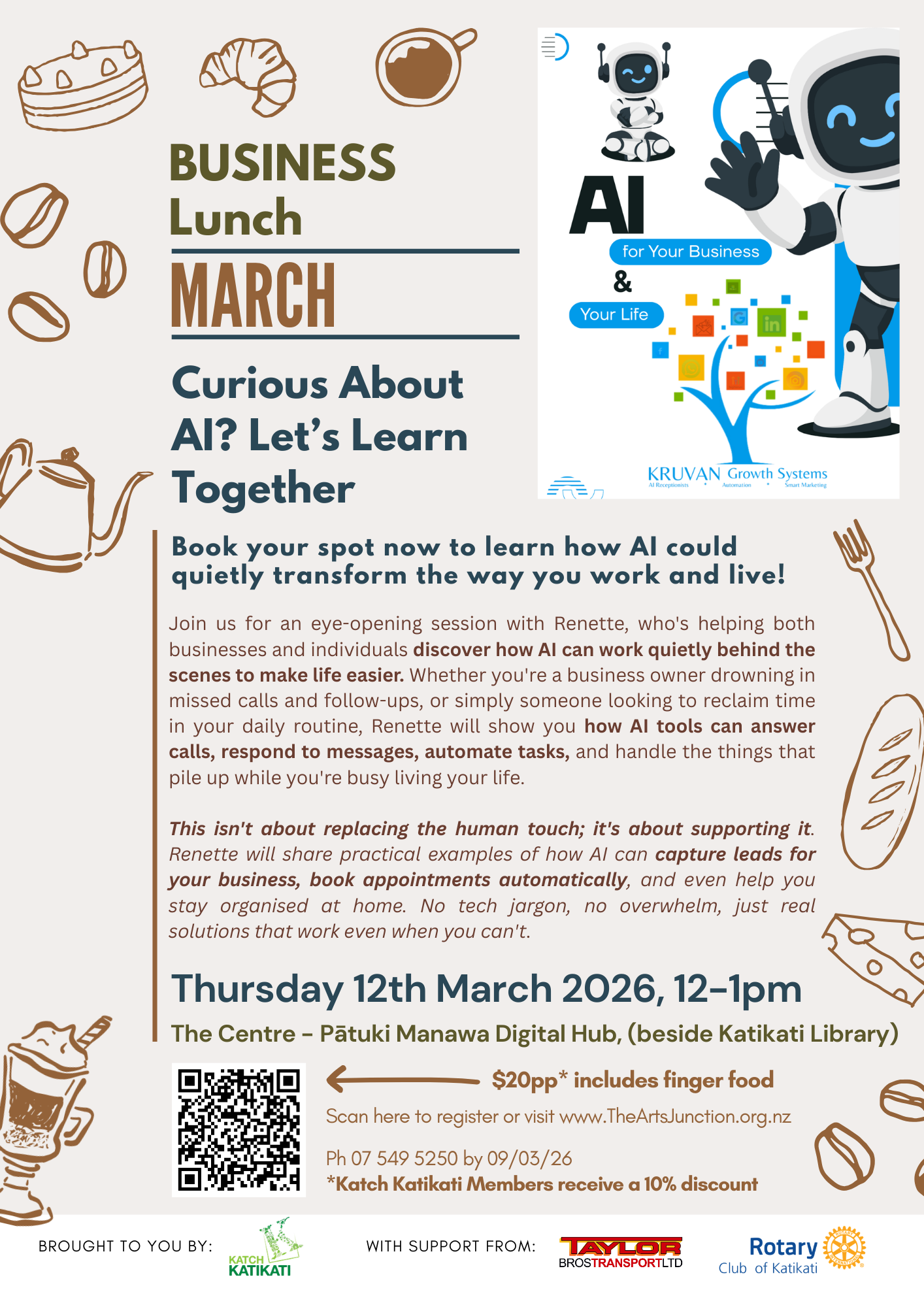 $20pp*. RSVP to info@katchkatikati.org.nz. Ph 07 549 5250.
